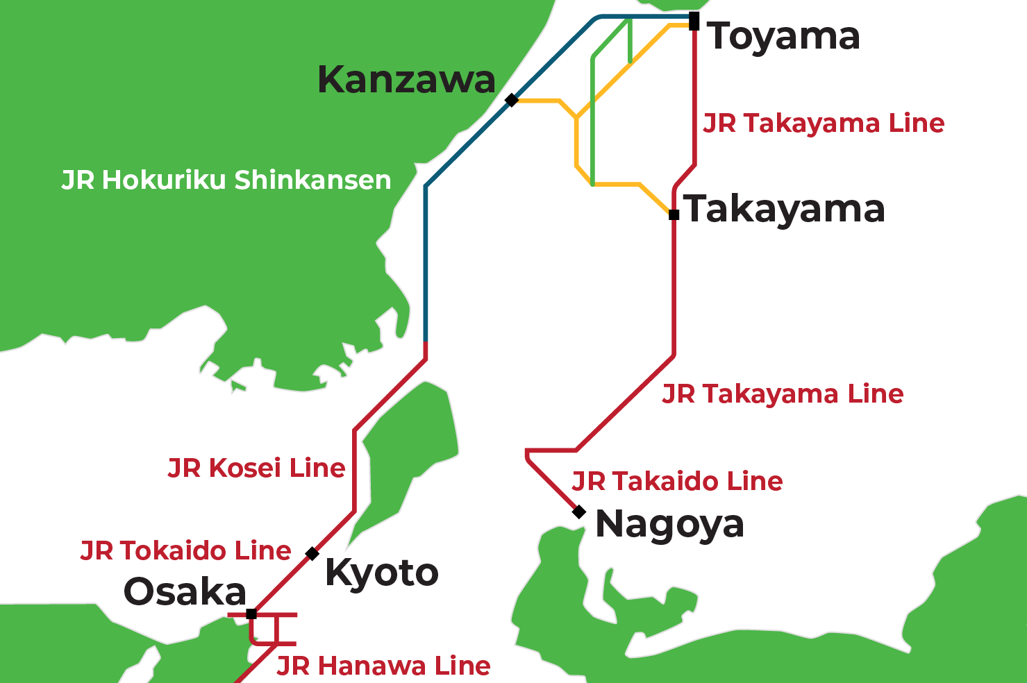 Conventional lines ・Nagoya〜Toyama Station (via the Tokaido Line and Takayama Line) ・Tsuruga, Kyoto Station〜Osaka City Station (via the Hokuriku Line, Kosei Line and Tokaido Line) ・Osaka City Station〜Kansai Airport Station (via the Hanwa Line and Kansai Airport Line)