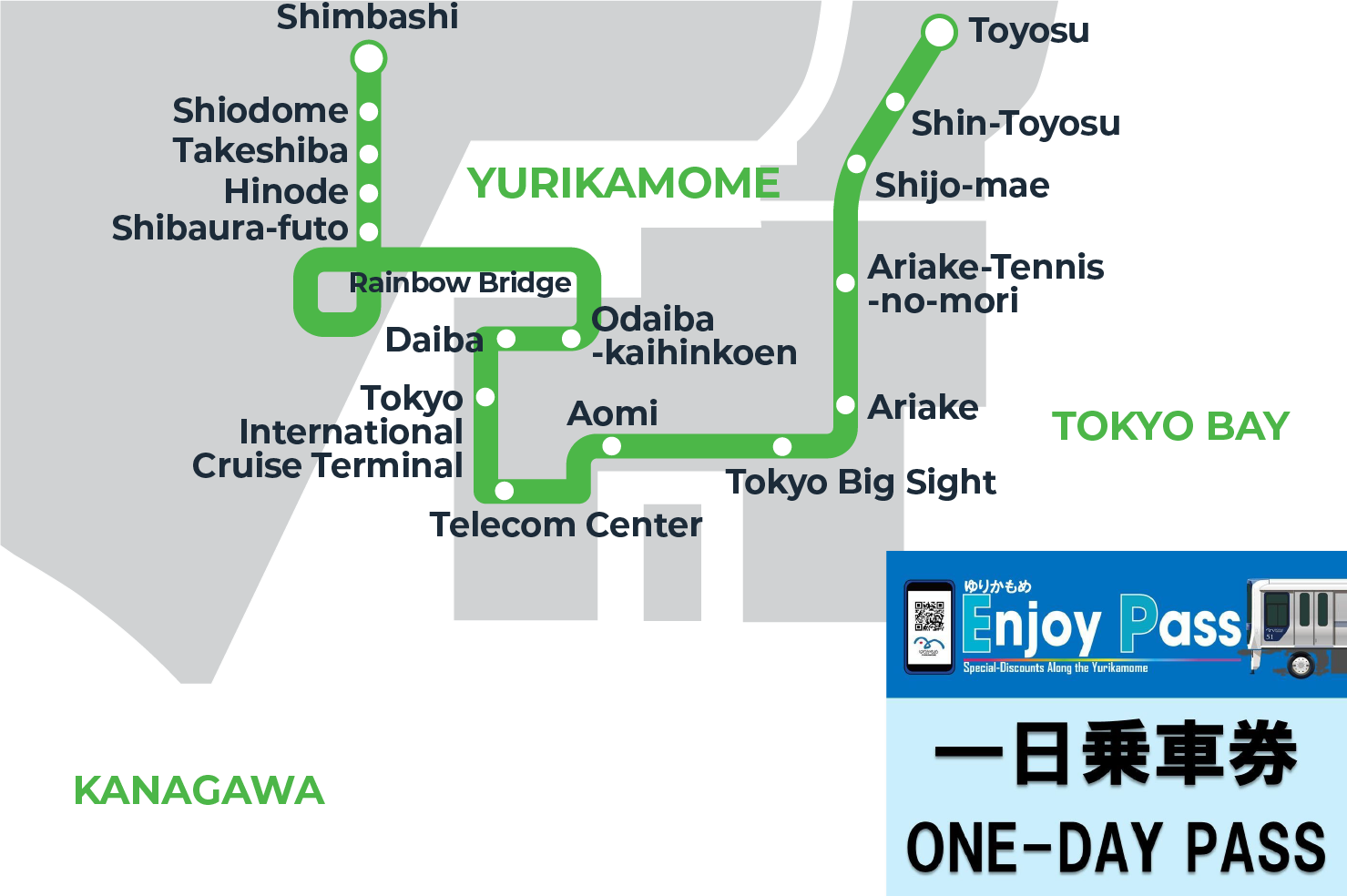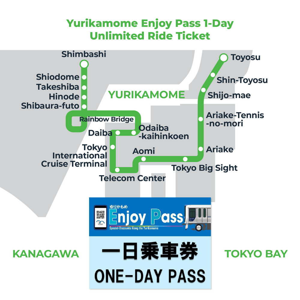The pass is valid for unlimited rides on the Yurikamome Line, covering all 16 stations:
