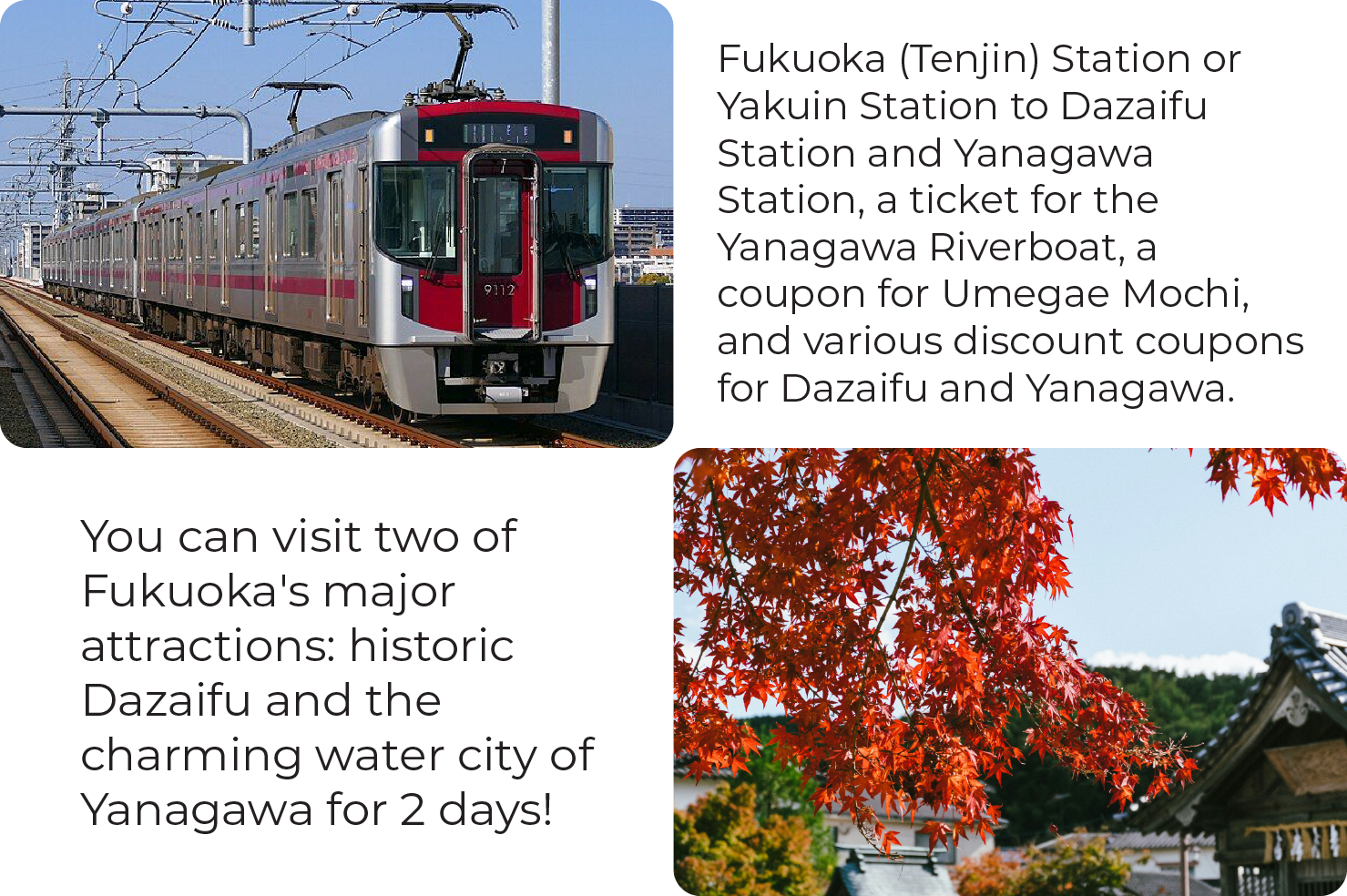 1. Round-trip Train Travel: Unlimited travel on Nishitetsu trains between Fukuoka (Tenjin or Yakuin) Station, Dazaifu Station, and Yanagawa Station.