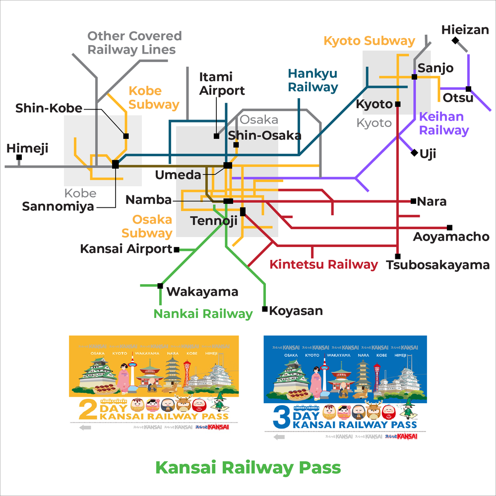 Pass CoverageUnlimited rides on metro and private railways in Kansai ✅ Covers Osaka, Kyoto, Kobe/Himeji, Nara, Wakayama, and ShigaNot valid on JR trains, Randen (Keifuku Railway), or buses
