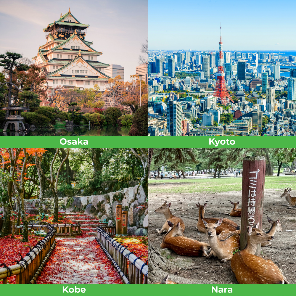 Osaka, Kyoto, Kobe/Himeji, Nara, Wakayama, and Shiga.