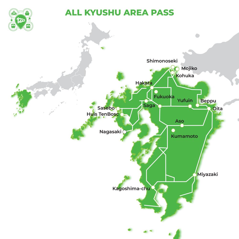 Main stations Fukuoka, Nagasaki, Shimonoseki, Mojiko, Kokura, Hakata, Yufuin, Beppu, Oita, Kumamoto, Aso, Saga, Huis Ten Bosch, and Sasebo.