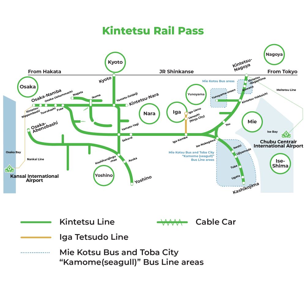 Kintetsu Rail Pass Coverage 🚆Unlimited rides on the Kintetsu Railway in Osaka, Nara, Kyoto provinces, and Nara Kotsu Bus Line. Not included: Limited Express train.